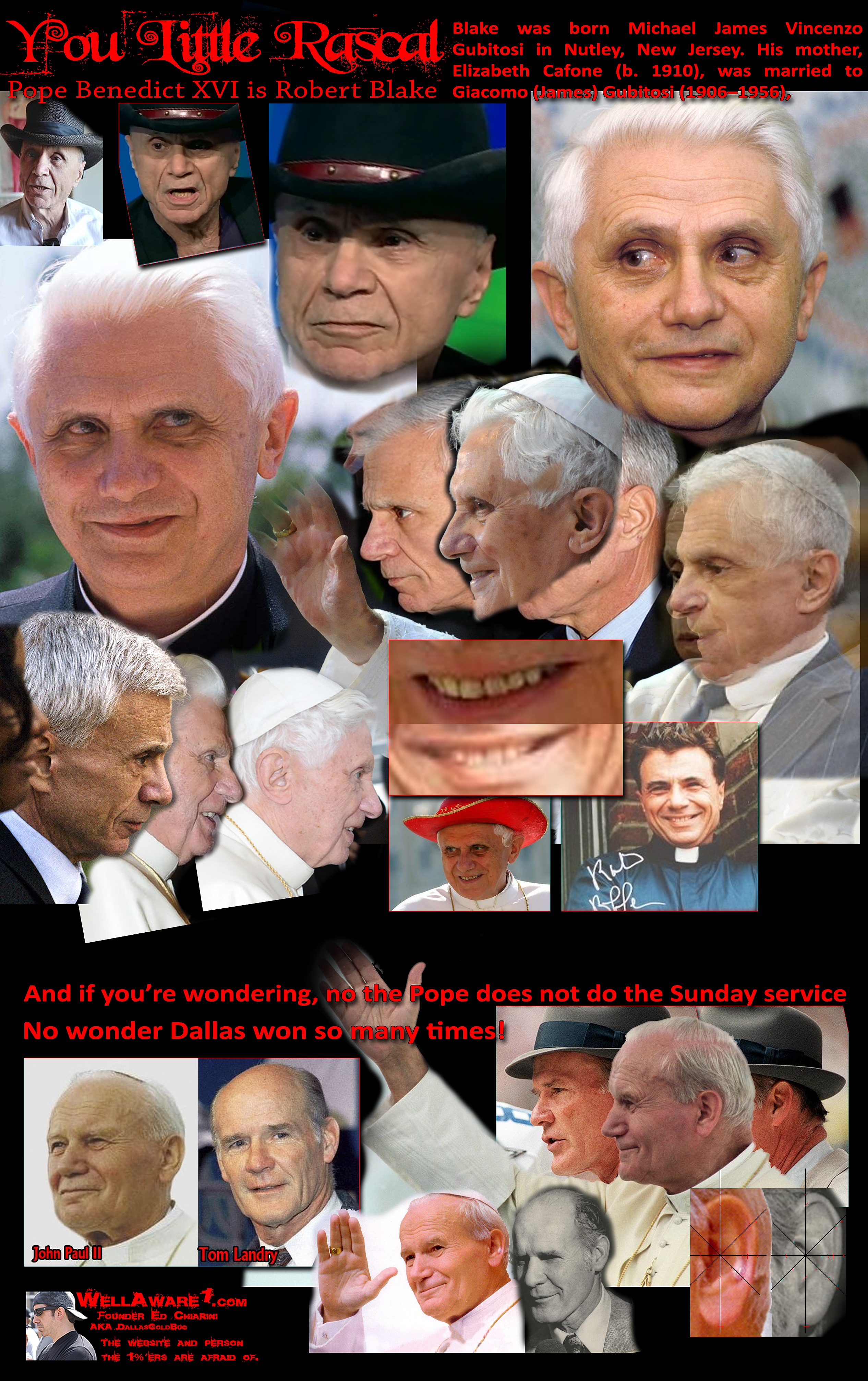 Posted on February 15, 2013, in Book of Revelation, Christian Paganism, Illuminati, New World Order and tagged Pope is a fraud, Pope is Robert Blake., Pope resigns. Bookmark the permalink. Comments Off on The Pope Exposed for the Fraud he is...